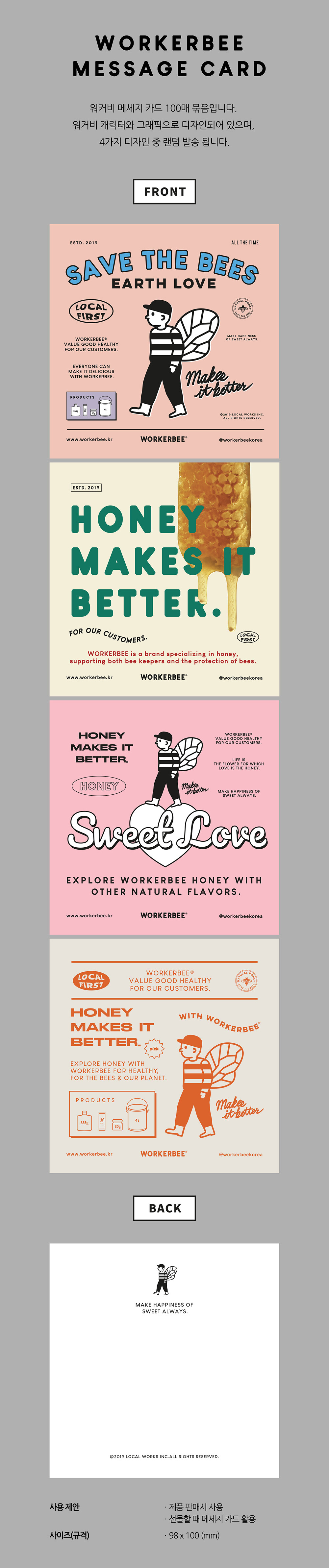 워커비 메세지 카드 100매 묶음입니다. 워커비 캐릭터와 그래픽으로 디자인되어 있으며, 4가지 디자인 중 랜덤 발송 됩니다.* 전자세금계산서 자동발행 됩니다. '현금영수증 신청' 체크 하지 마세요*