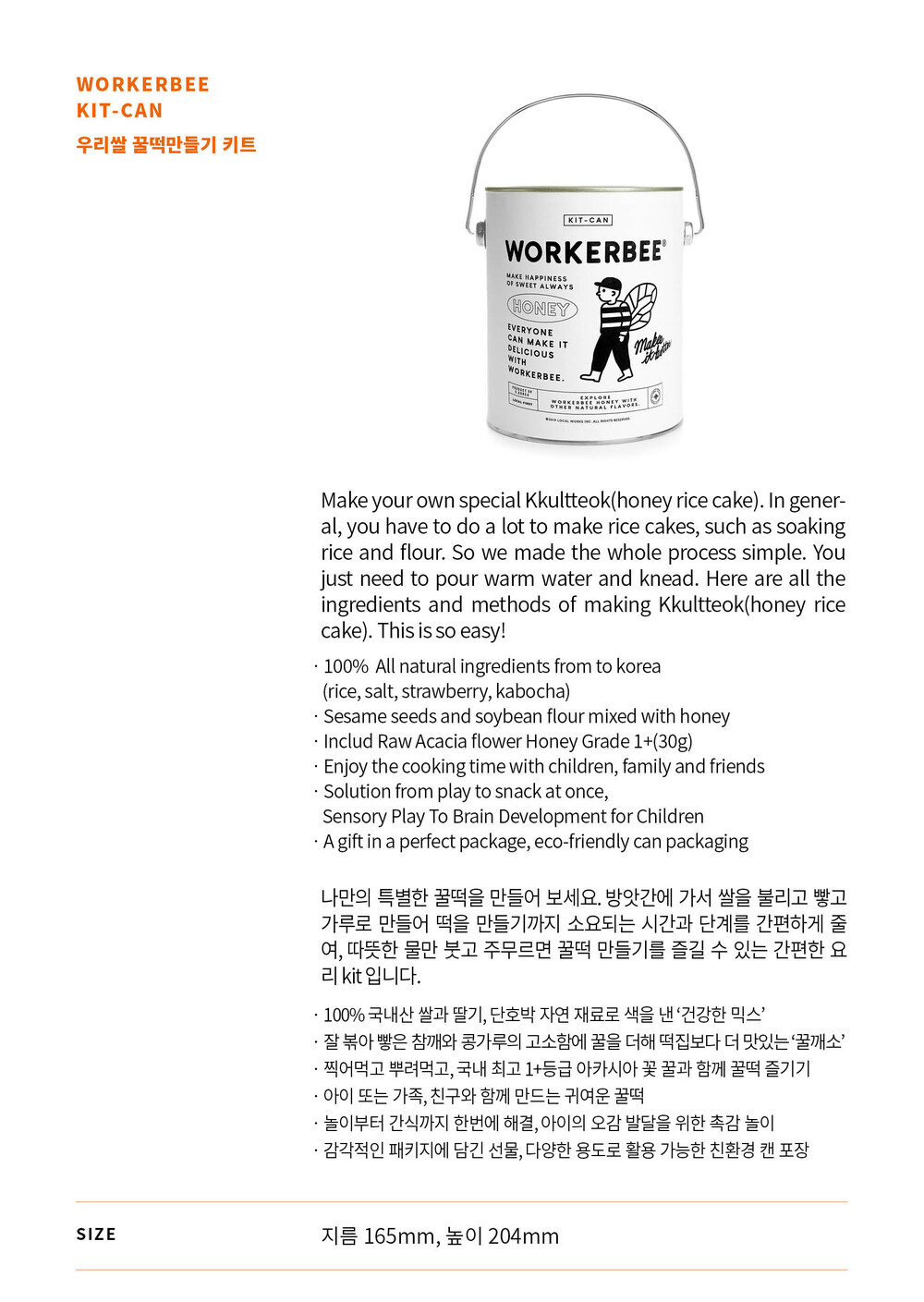 ㆍ100% All natural ingredients from to korea (rice, salt, strawberry, kabocha) ㆍSesame seeds and soybean flour mixed with honey ㆍInclud Raw Acacia flower Honey Grade 1+(30g) ㆍEnjoy the cooking time with children, family and friends ㆍSolution from play to snack at once, Sensory Play To Brain Development for Children ㆍA gift in a perfect package, eco-friendly can packaging
