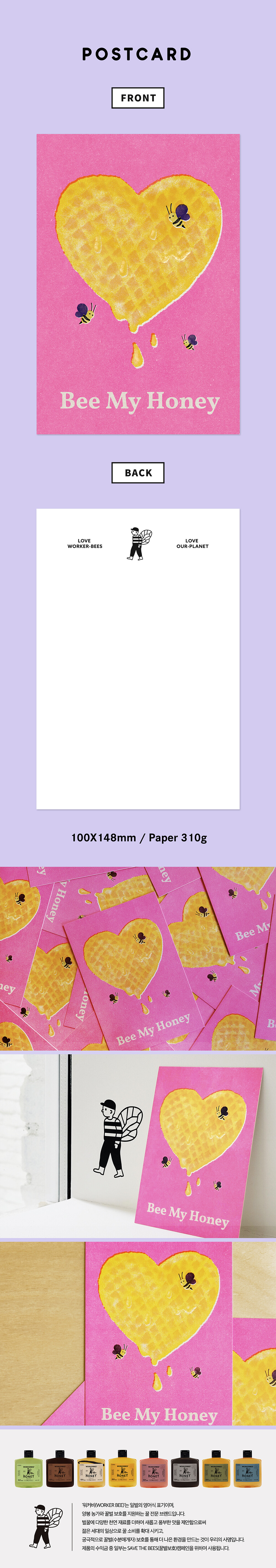 HONEY 만큼 달콤한 사랑의 단어가 또 있을까요? 사랑 고백 같기도, 꿀벌의 농담 같기도 한 달콤한 꿀 한 방울의 위트를 담은 워커비 Bee My Honey 엽서입니다. 꿀이 흐르다 못해 뚝뚝 떨어지는 하트 모양의 벌집 꿀에 핑크빛 사랑고백을 담아두었습니다. 달콤한 꿀 한 방울의 사랑과 고백의 설렘이 전달되기를 바라요.